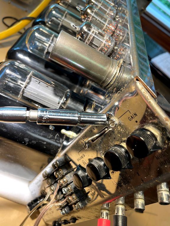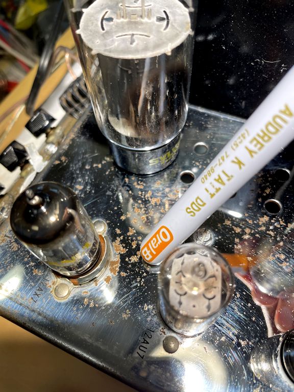 One of the 6L6 output tubes had a broken key on its underside. In this