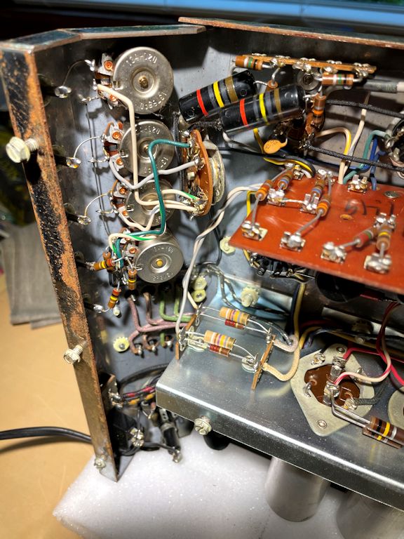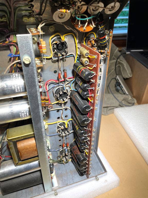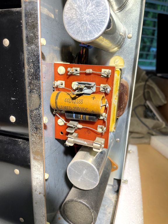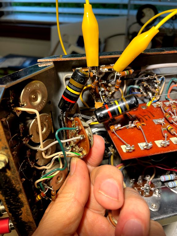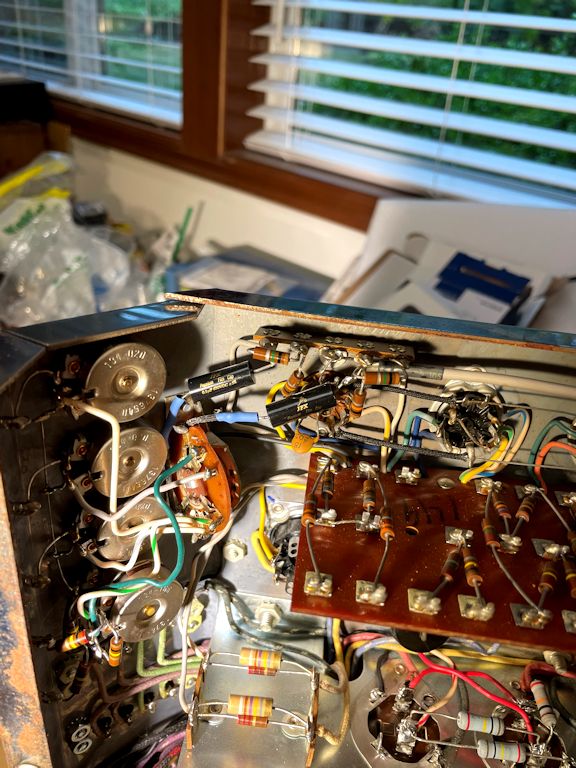 The next photo shows the new caps (C1, C11) installed, with the mode switch back in place.
