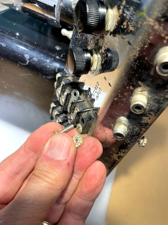 The chrome chassis is layered with crud, as if the amp was stored in a barn or unheated outbuilding.