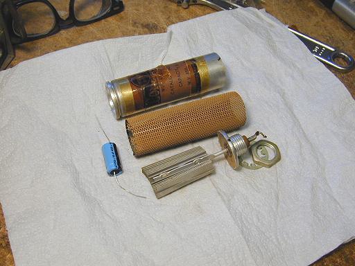 I don't always take such pains, but in this case I spent the extra time to "restuff" the original electrolytic capacitors, which are mounted in aluminum cylinders above the chassis. The following photos illustrate the process, which basically amounts to cutting open the old can, removing its innards, replacing them with one or more new capacitors, and sealing the can back up with epoxy.