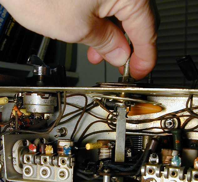 The flat bandshaft is held onto the bandswitch with a tight spring clip. I wasn't able to free it from the clip until I loosened the bandswitch mounting outside the chassis and rocked the assembly to one side, as shown below. Once that's done, you can draw out the bandshaft from below. Note: While the bandshaft is out, be careful not to move the bandswitch connection or the switch wafers, which could disturb the tuning and goof up a lot of circuit connections.