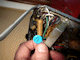 still attached by its leads, and then unscrew and slide off its cage cover to access the innards.