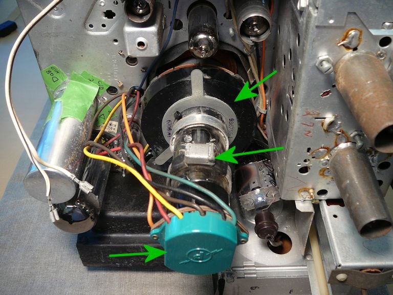 The following photo gives a peek inside the 14-S-7070 tuner. Arrows point to important contact