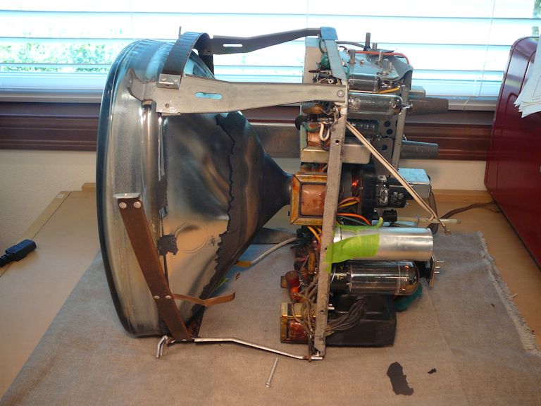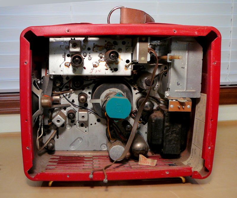 As with many old TVs, this one was dirty inside, and one corner of the cabinet was slightly bent,