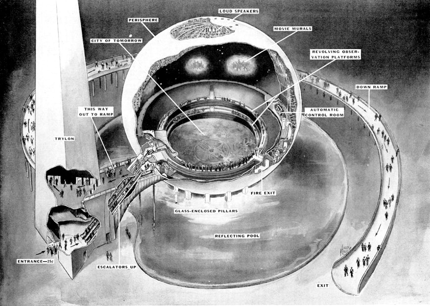 visitors entered through the base of the Trylon and rode an escalator up into the Perisphere, where,