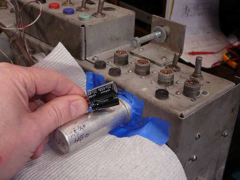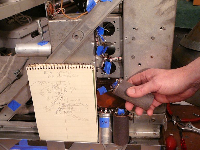 finished restuffing capacitor C5, temporarily taping its can back in place, and