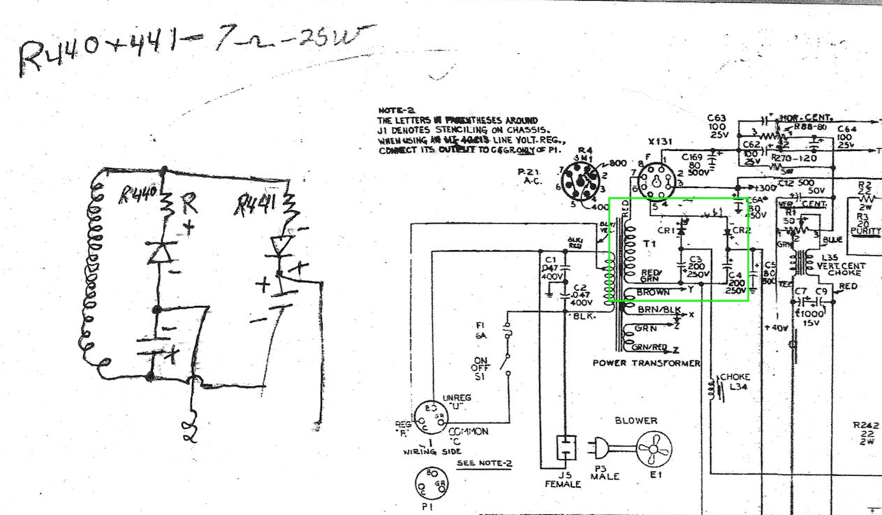 7-ohm, 25-watt resistors, R440 and R441, in series with the rectifiers. I assume