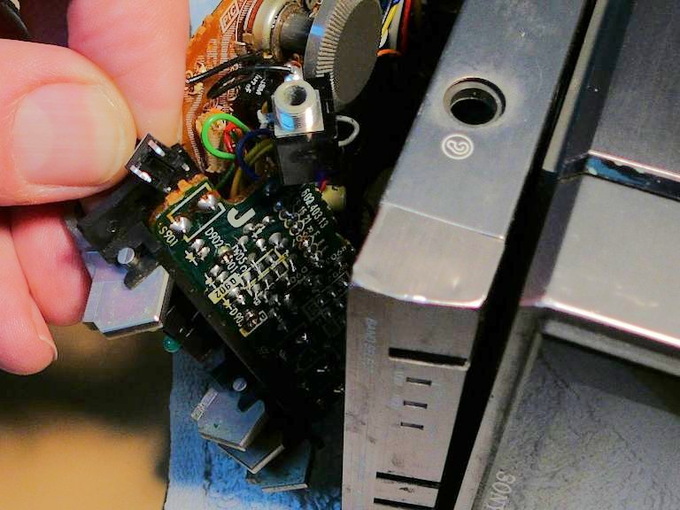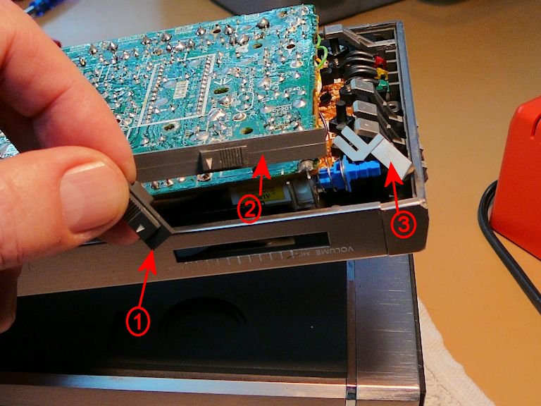 As you lift the board, you may find that other parts fall out, such as the manual tuning knob.