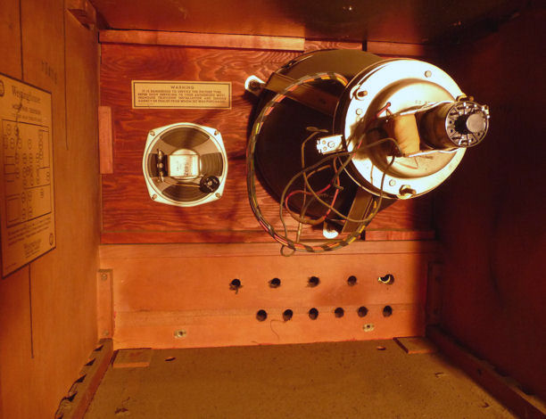 concealed behind a removable wooden panel, are controls for the technician: Focus, Vertical