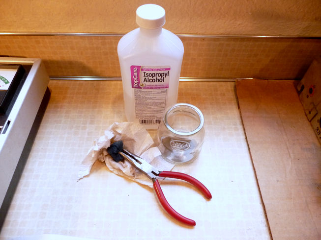 alcohol and paper towels. For tight spaces, I use a piece of 3M no-scratch