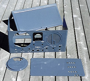 The S-20R cabinet comes apart in four pieces. One piece forms the front panel and sides. A second circular piece with the S-20R logo is held inside the front panel with screws, covering the main tuning dial. A third piece forms the back and top, with a hinged cover. The fourth piece is the case bottom, with rows of access holes for aligning the receiver.