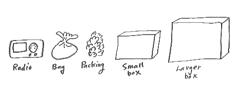 7. Tape the small box shut. Shake it around a little, to see whether the radio shifts inside the box. If it does, open the box and add more packing material.