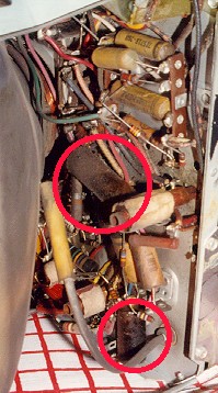 Considering where I had started, with no image at all, this was a major improvement for one night's work. I powered the set down and started to compile my shopping list, including a complete schematic and replacement capacitors. In the next photo, the circles identify a couple of old wax paper capacitors that look very