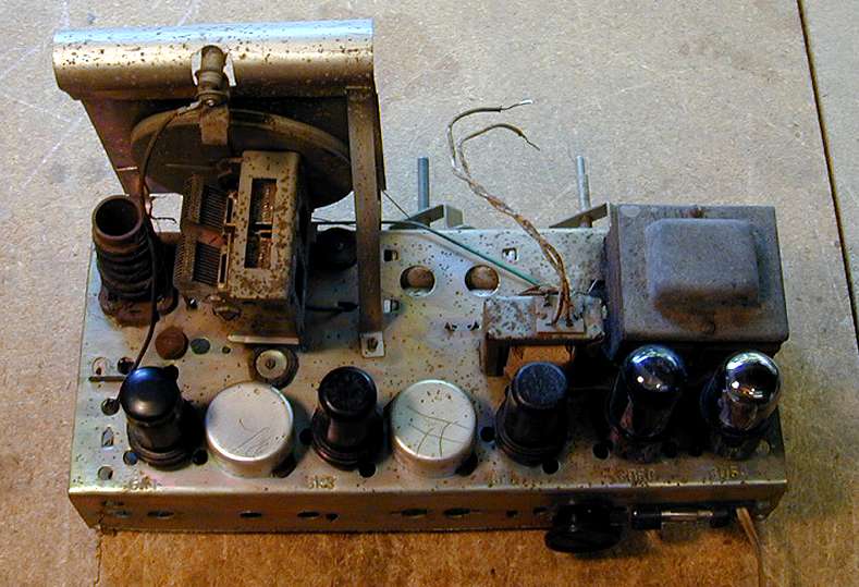 Inside the cabinet is a basic five-tube radio. The tubes are types 6A7, 6K3, 6G2, 6P6S, and 6Z5S.
