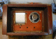The first photo shows the unrestored radio. The front panel of the radio is covered with fabric, which