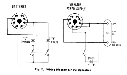 The receiver may be operated from an external DC source, such as a vibrator power supply or batteries, by removing the AC JUMPER PLUG normally located in the POWER SOCKET at the rear of the receiver, and replacing it with a similar octal plug wired as shown in Fig. 2. Note that pins 7 and 8 of the DC plug are connected together by a jumper wire so that the 4H4 current regulator tube is automatically disconnected to supply the correct heater voltage to the 6UB tube when Operating from an external 6-volt source. The voltage and current requirements for DC operation are as follows: "B" supply, 300 volts at 200 ma; "A" supply, 6 volts at 6 amps.