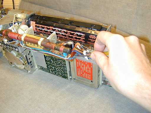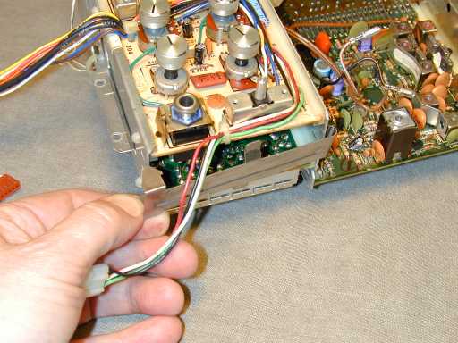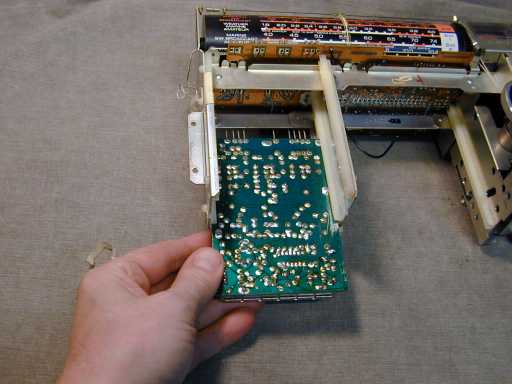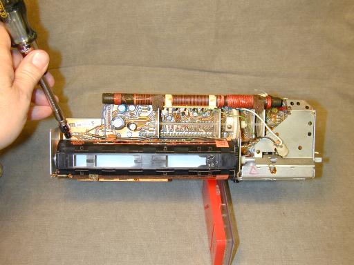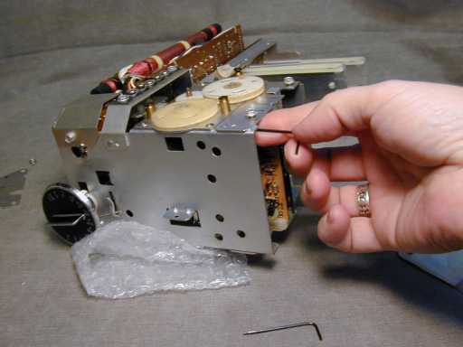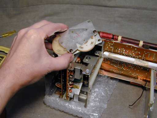 To begin removing the tuner boards, turn the chassis over and unscrew the tuning gear assembly. It is held