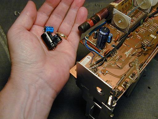 the filter capacitors. In this photo, the old capacitors are in my hand and the new ones are installed